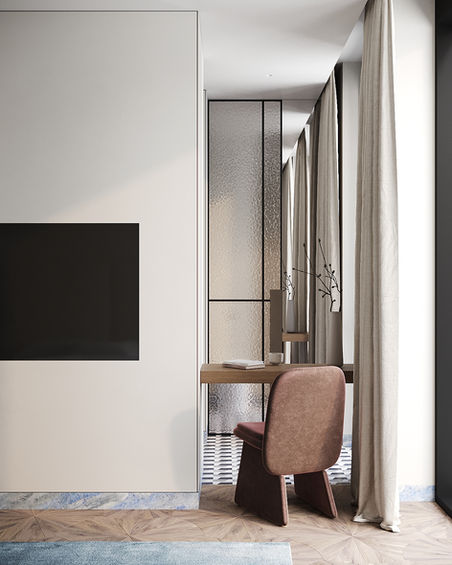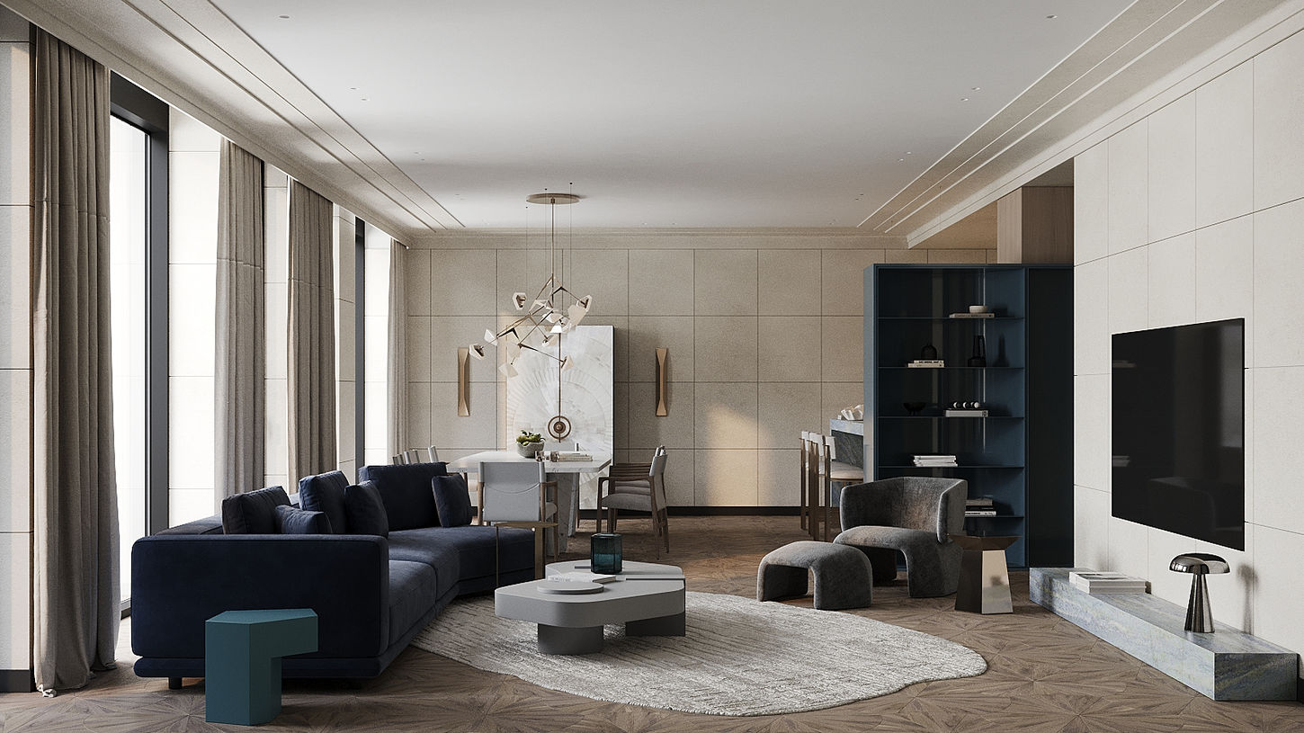 Пространство квартиры выстроено по принципу современной открытой планировки, в которой кухня, столовая и зона отдыха объединены в единое целое. Панорамное остекление вдоль всей фасадной стены наполняет интерьер естественным светом и визуально усиливает ощущение простора.